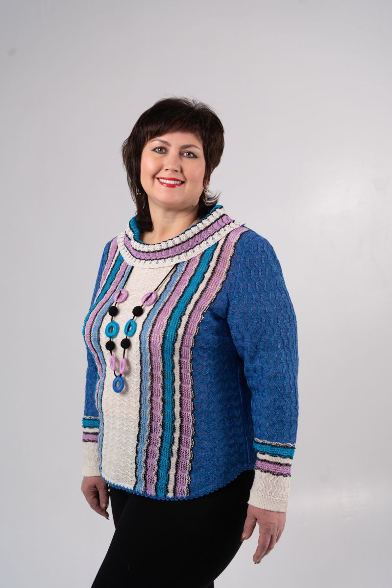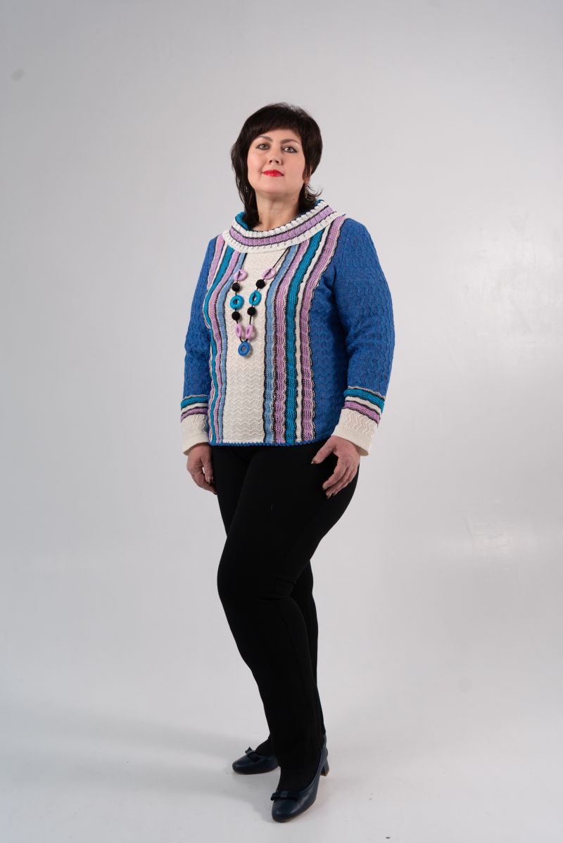 Описание: Джемпер с украшением, длинный рукав, высокий воротник, трикотаж. 52 размер 60,5см, рукав 58см. 58 размер 62см, рукав 58см.