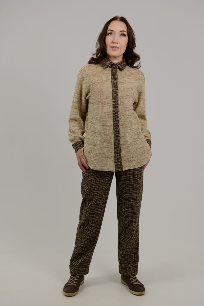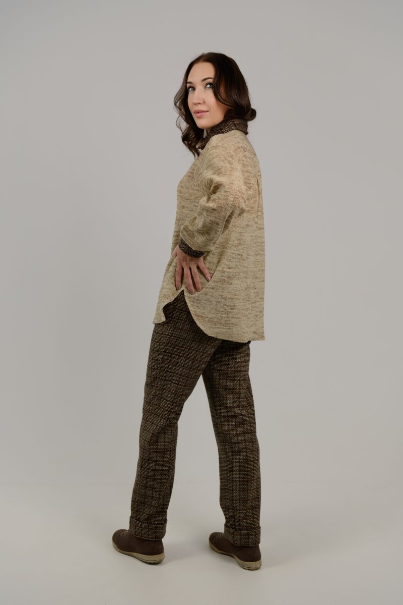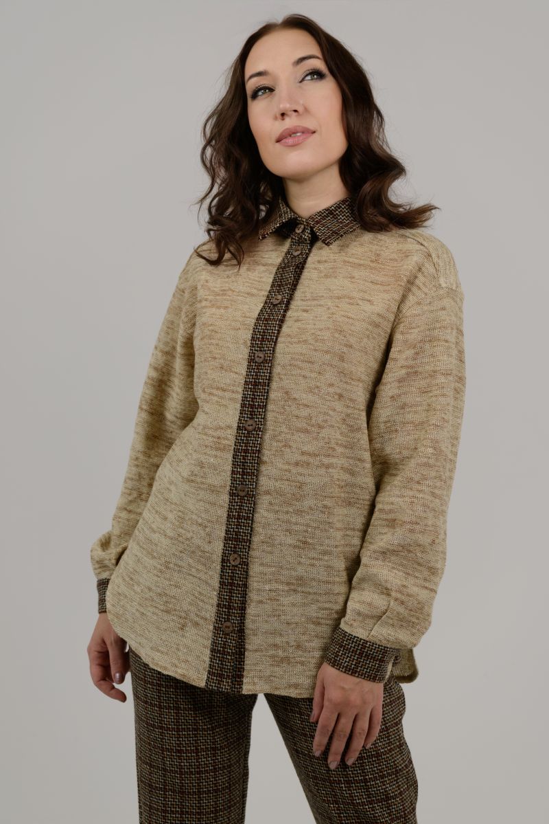 Описание: Блуза трикотажная в сочетании с тканью, застежка на пуговицы.