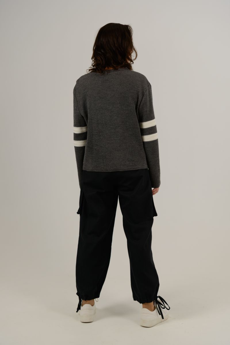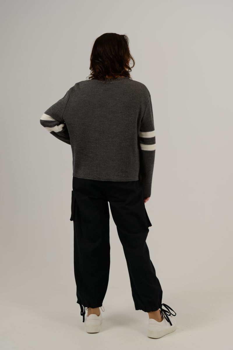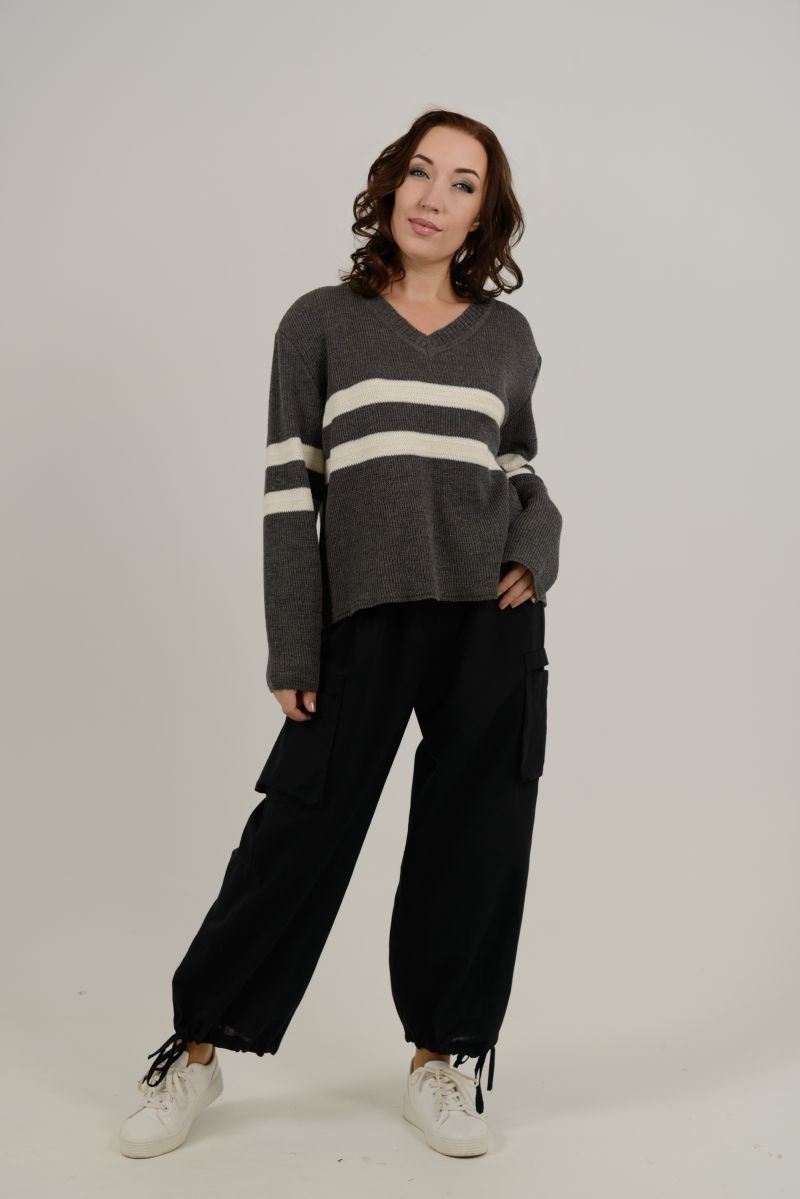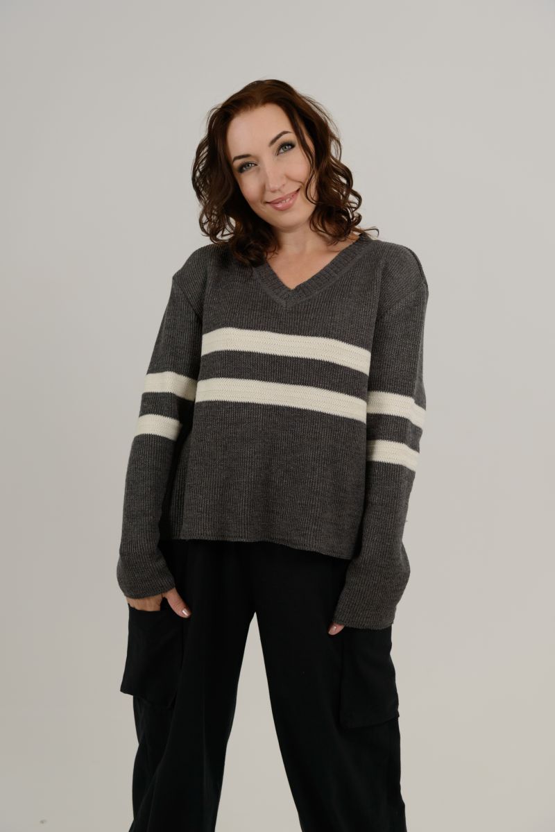 Описание: Джемпер свободного силуэта, длинный рукав, линия плеча спущена, плотный трикотаж полосы.