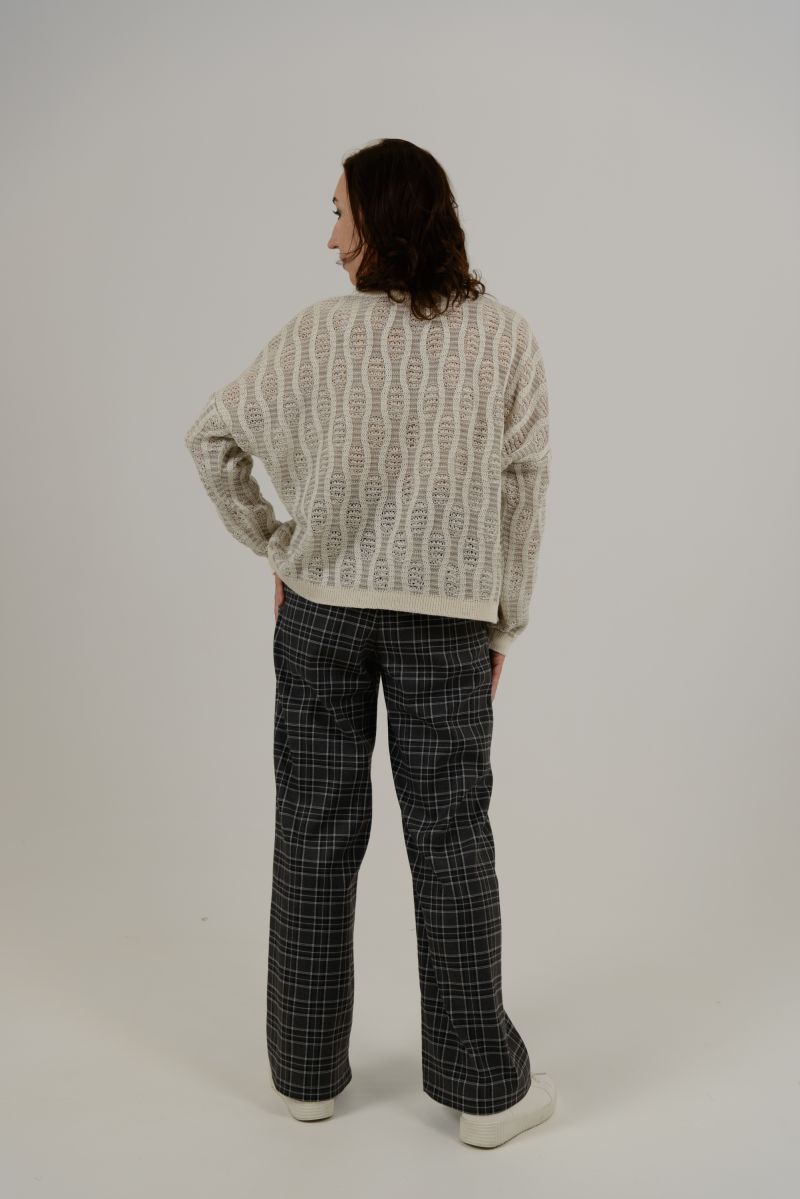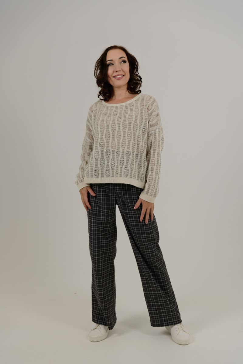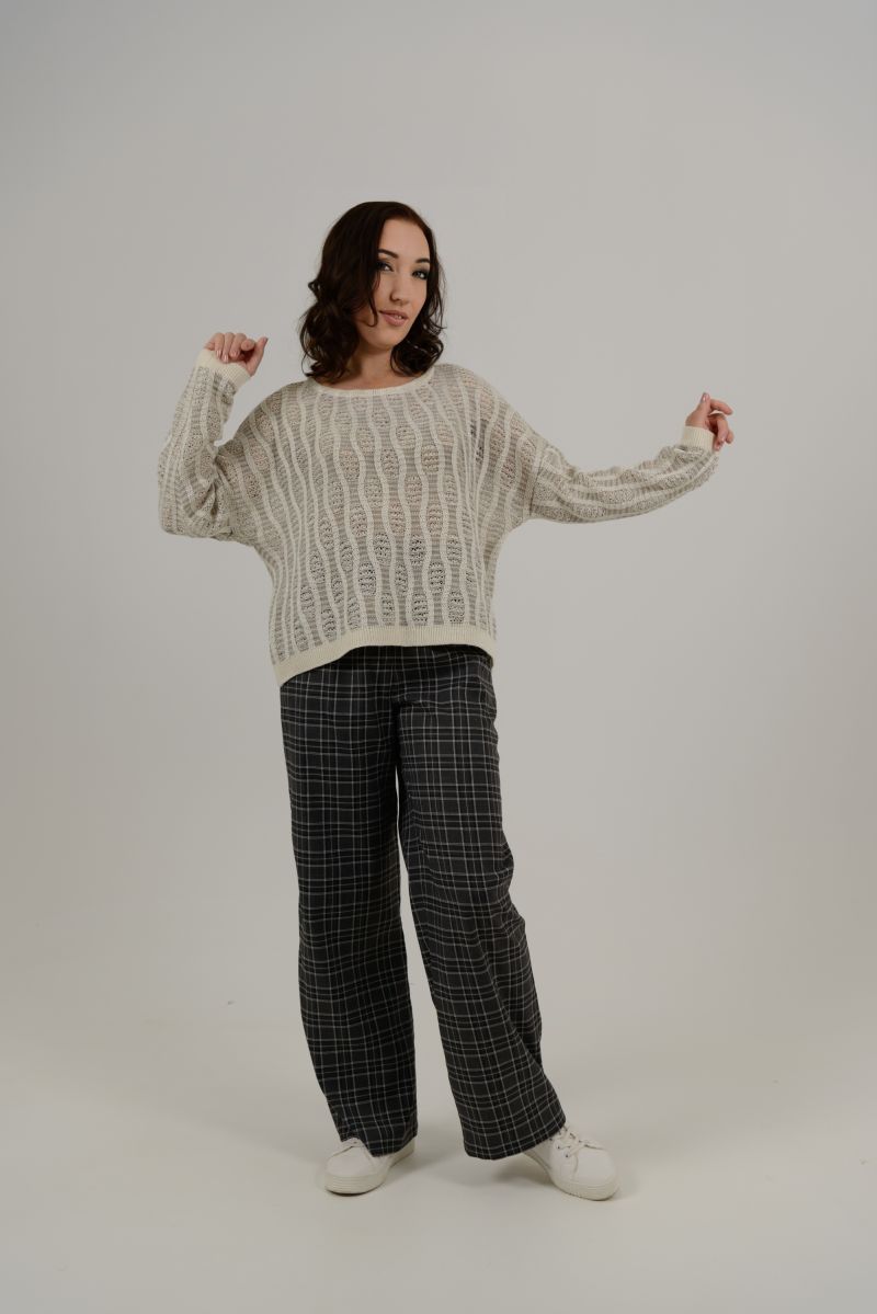 Описание: Джемпер свободного силуэта, длинный рукав, спущенная линия плеча, рыхлый трикотаж, полосы.