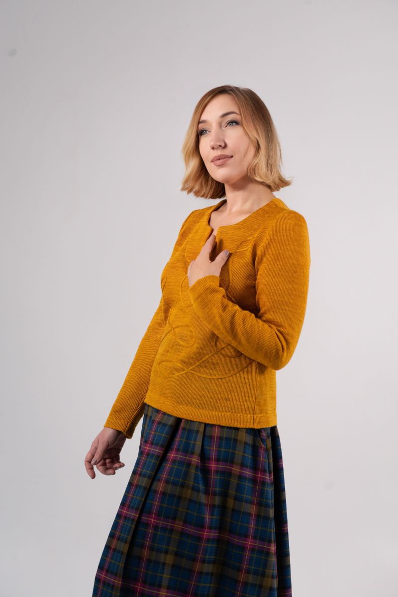 Описание: Джемпер с длинным рукавом, фигурный вырез горловины, отделка, трикотаж, 46 размер 55см, рукав 58,5см; 52 размер 57см, рукав 58,5см.