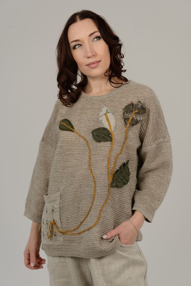 Описание: Джемпер, линия плеча спущенная, один карман, отделка, трикотаж.