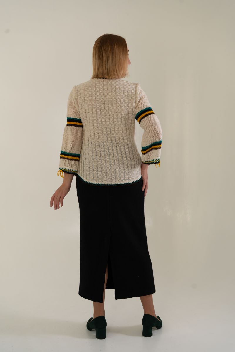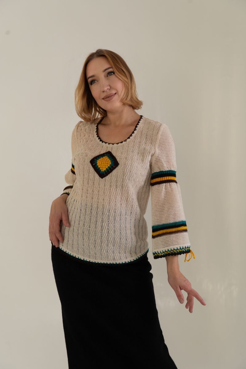 Описание: Джемпер с широким рукавом, неровная линия низа, отделка крючок, трикотаж