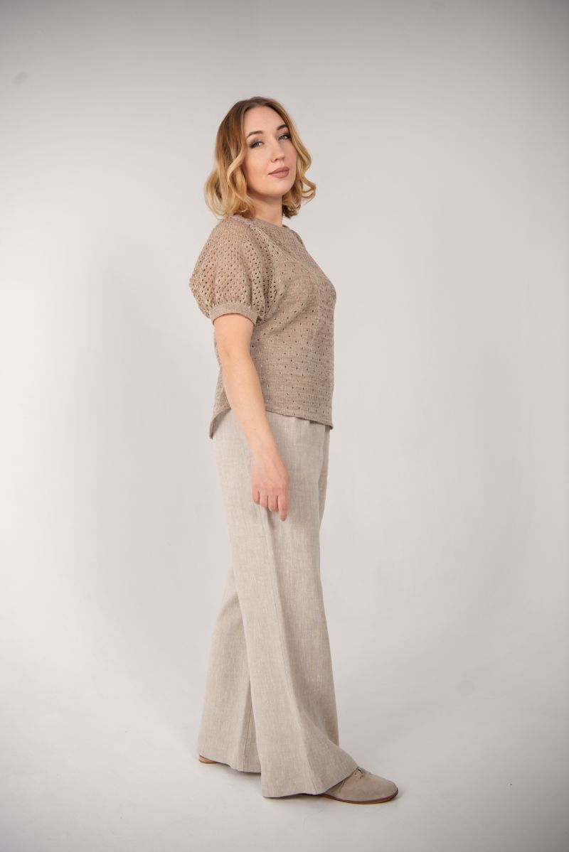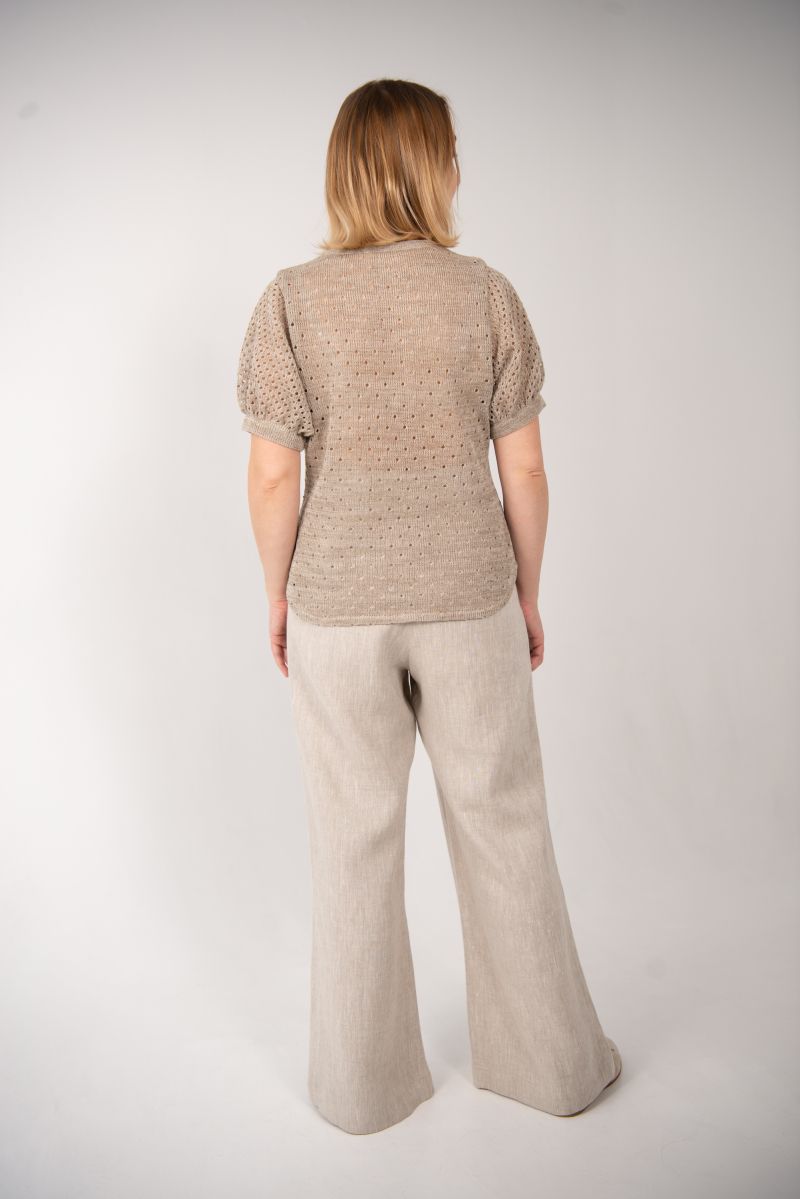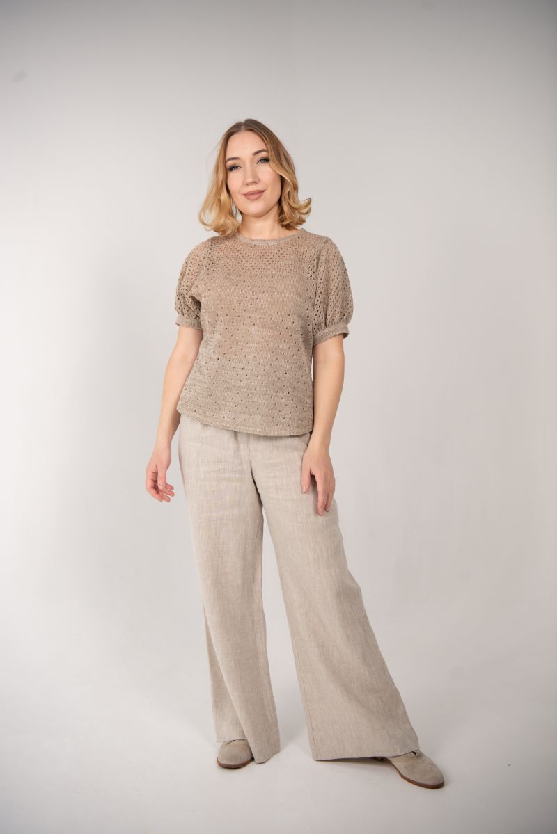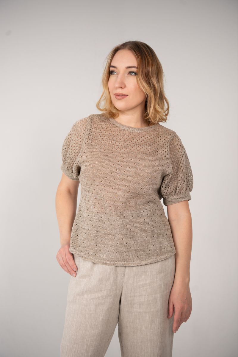 Описание: Джемпер с рукавом на сборке, низ закругленный, трикотаж с ажуром. 46 размер 58см, рукав 24см.