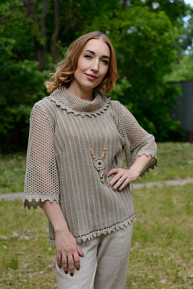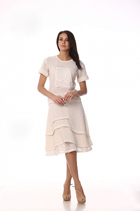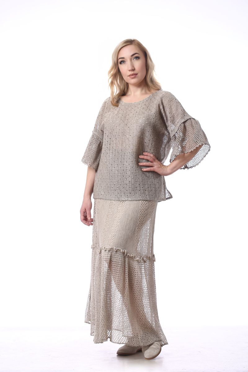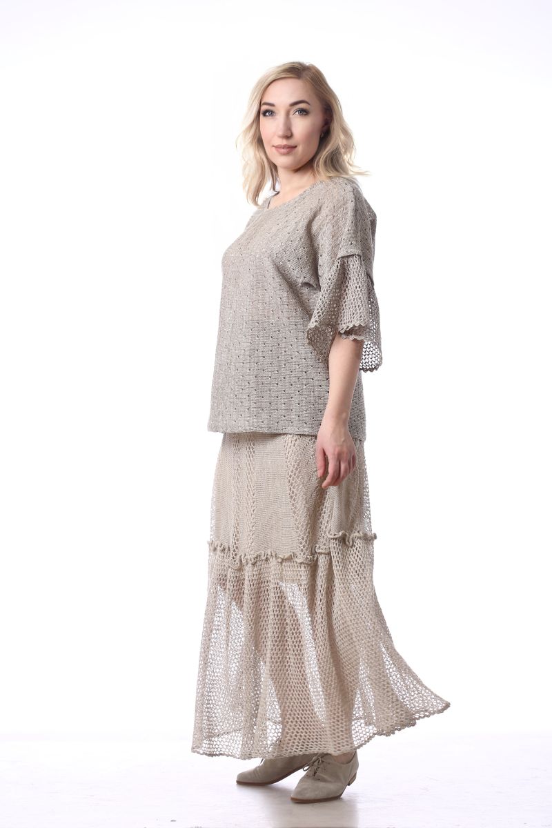 Описание: Джемпер, линия плеча спущена, с ажурным воланом, по бокам разрезы, трикотаж