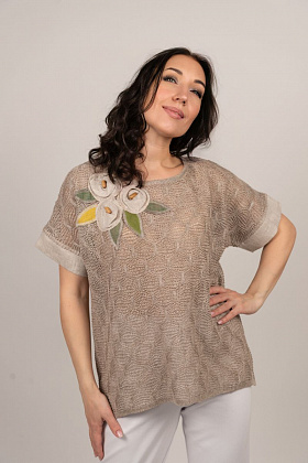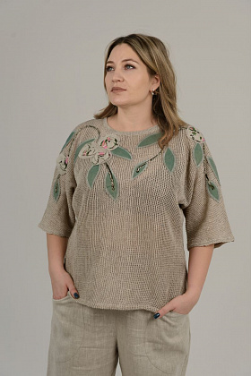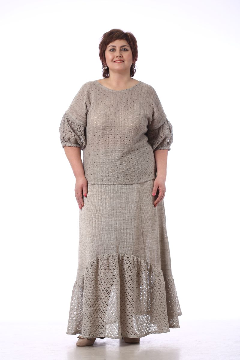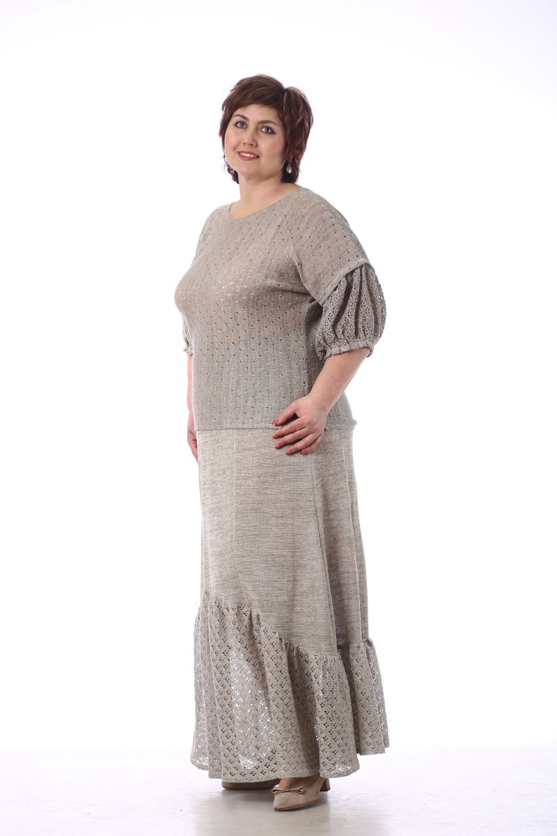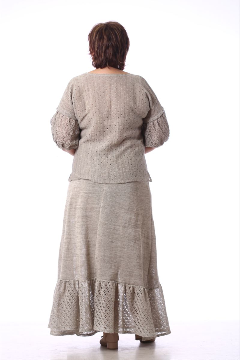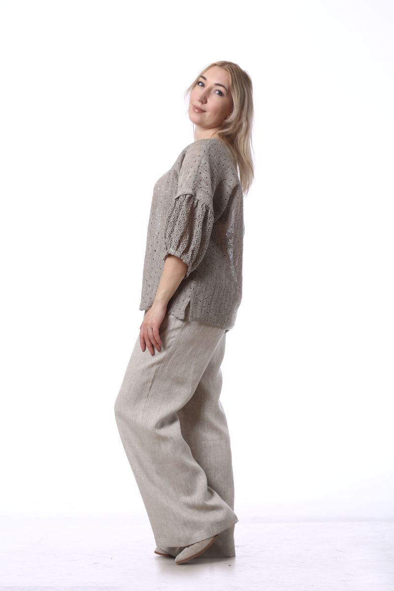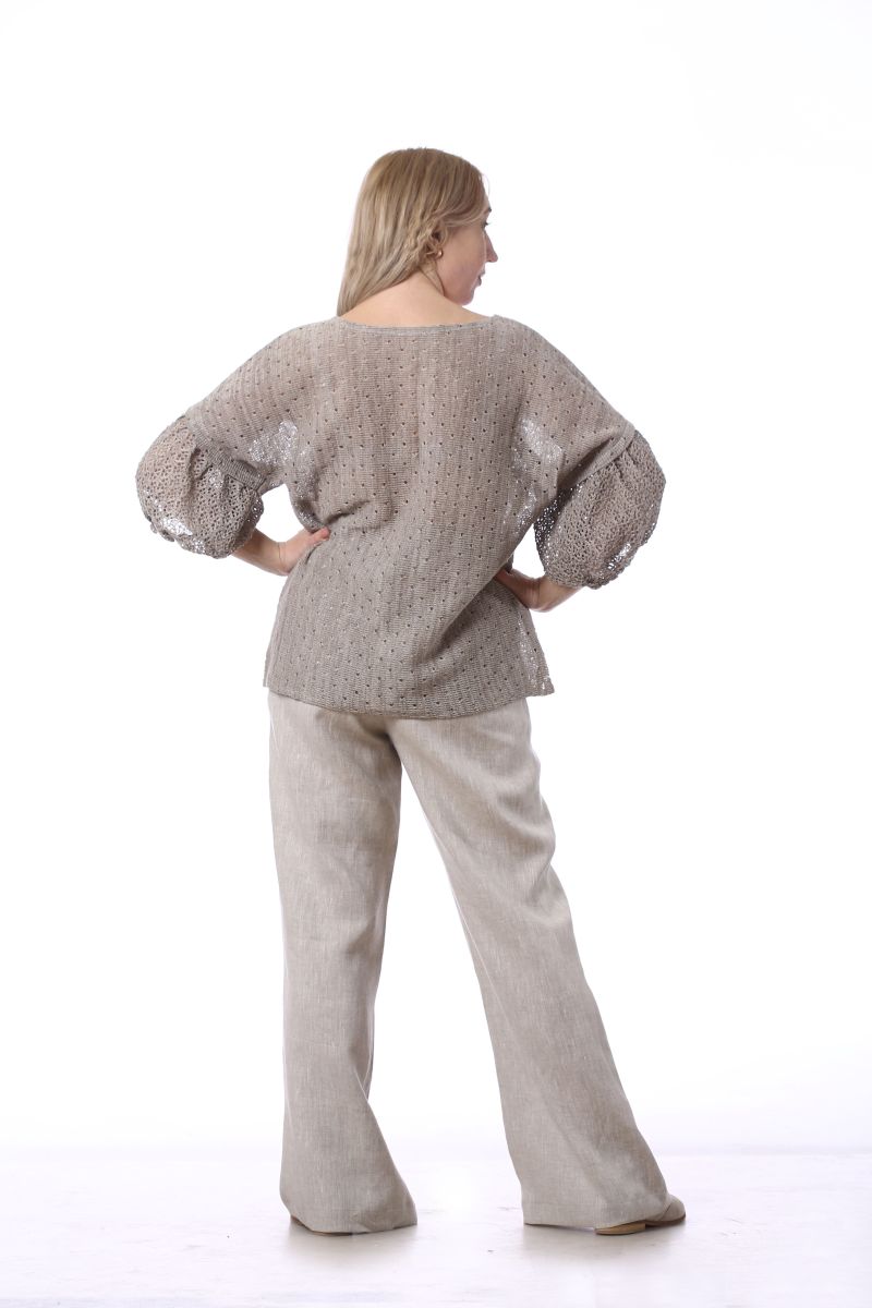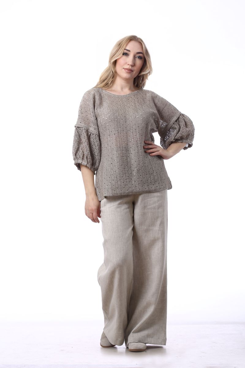 Описание: Джемпер, линия плеча спущена, рукав с воланом на сборке внизу, по бокам разрезы, трикотаж с ажуром