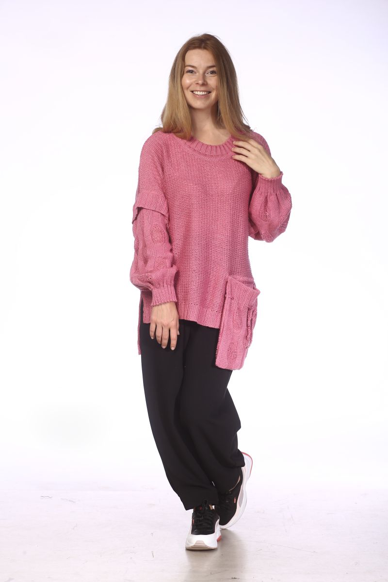 Описание: Джемпер свободного силуэта, удлиненная спинка, по бокам разрезы, большой карман-сумочка, линия плеча спущена, рыхлый трикотаж