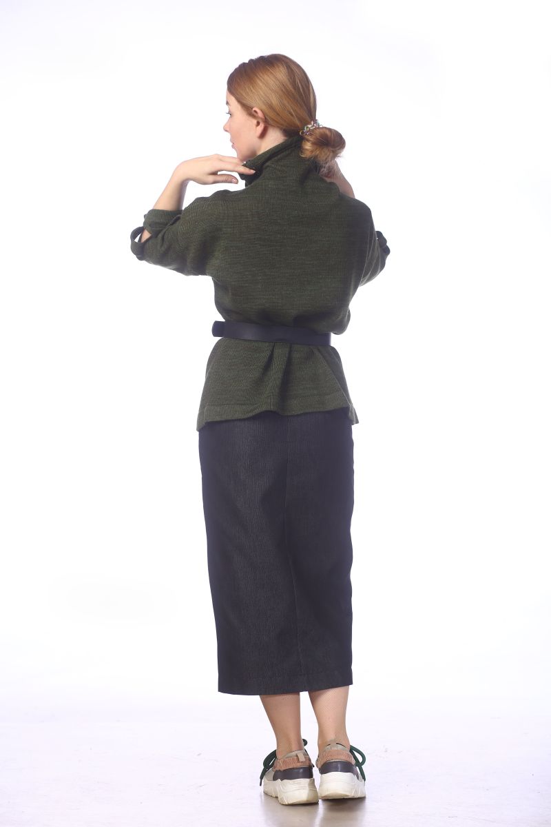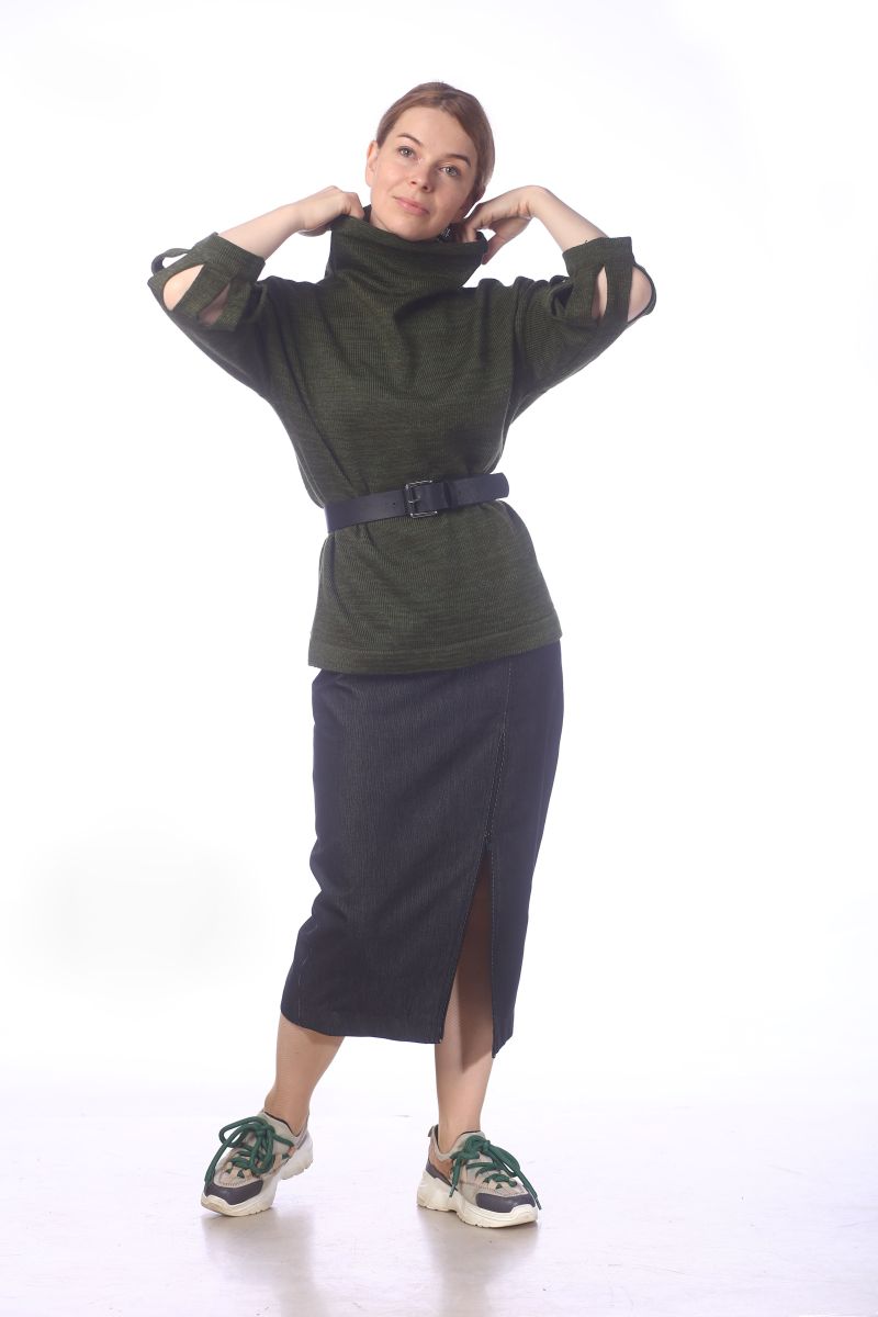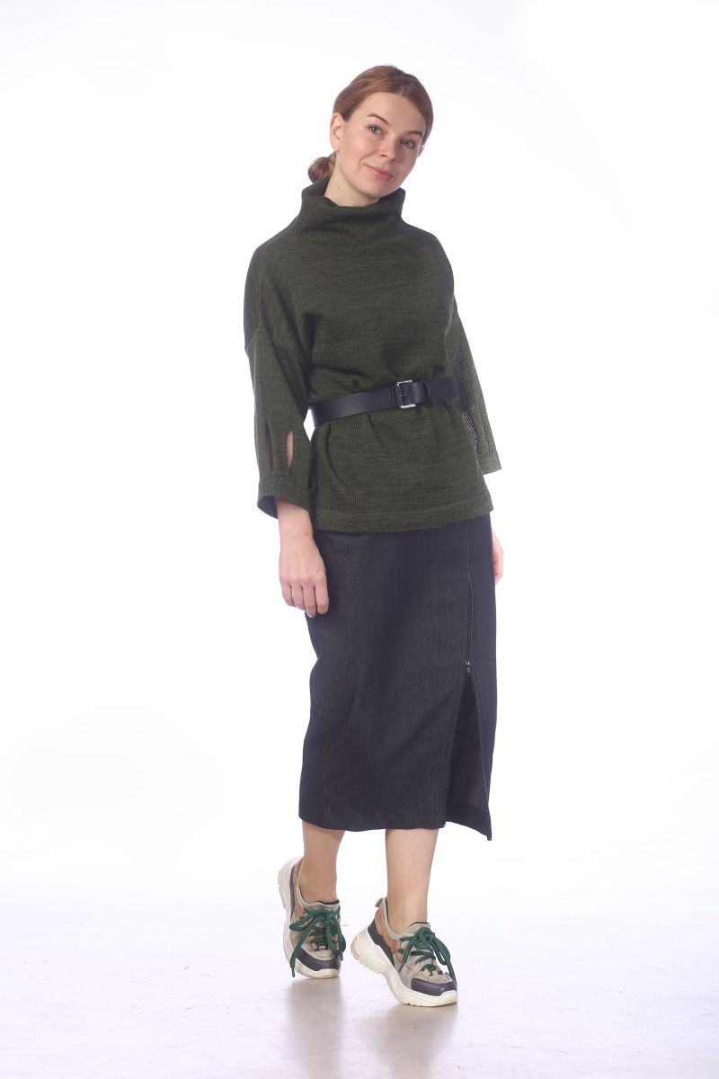 Описание: Джемпер с воротником стойка, рукав длиной 7/8 на манжете с декоративными дырами, трикотаж
