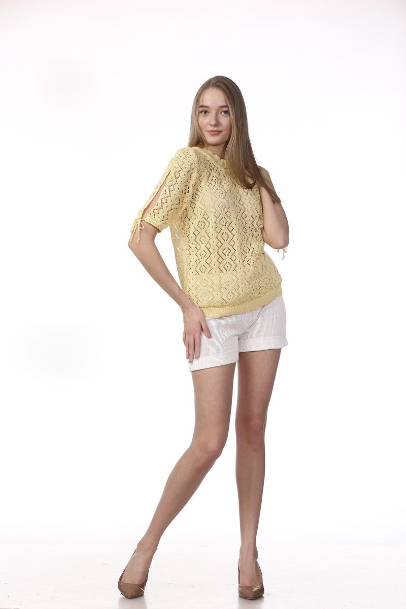 Описание: Джемпер, воротник стойка, рукава с разрезом, отделка крючок, трикотаж с ажуром, внизу резина, 50 размер 58см, рукав 30см.