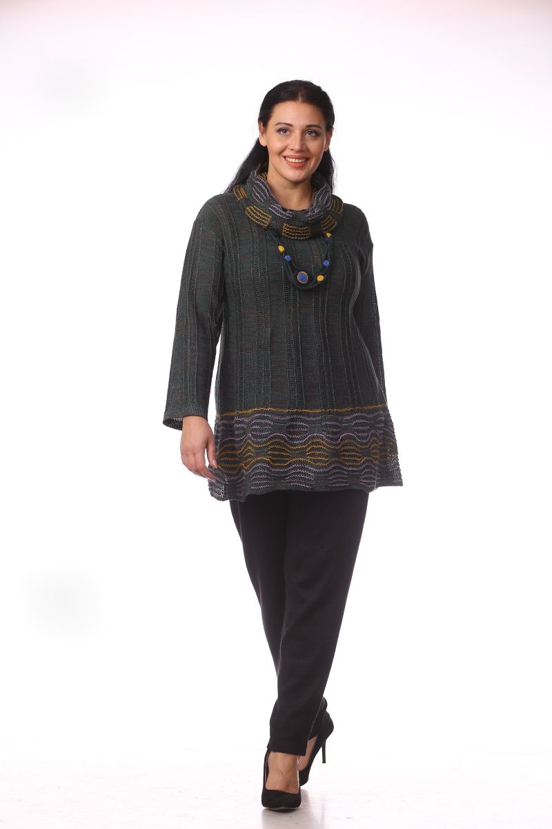 Описание: Туника с воротником хомут, украшение, трикотаж, 52 размер 70см, рукав с плечом 66см.