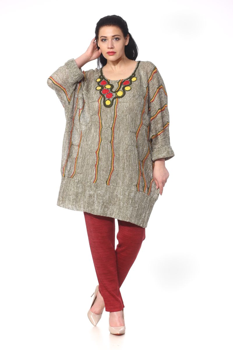 Описание: Туника свободного силуэта, отделка, трикотаж, 58 размер 98см, рукав 56см.