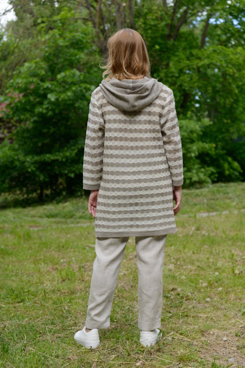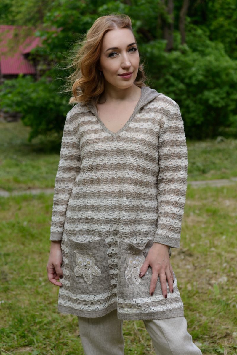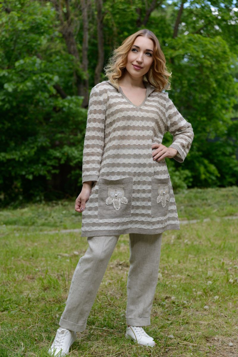 Описание: Туника с капюшоном, длинный рукав, карманы, отделка крючок, трикотаж.
